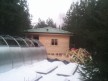 На фото баня с душевой комнатой, санузлом (здесь располагаются унитаз, раковина и душевое оборудование с бойлером), комнатой отдыха и предбанником. Баня одноэтажная с чердаком, общая площадь 33 кв.м. Построена по каркасной технологии, однако этот проект также можно строить из профилированного бруса — сухой, клееный или естественной влажности на выбор.