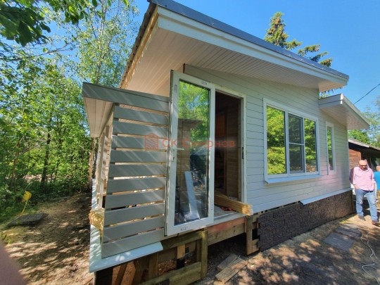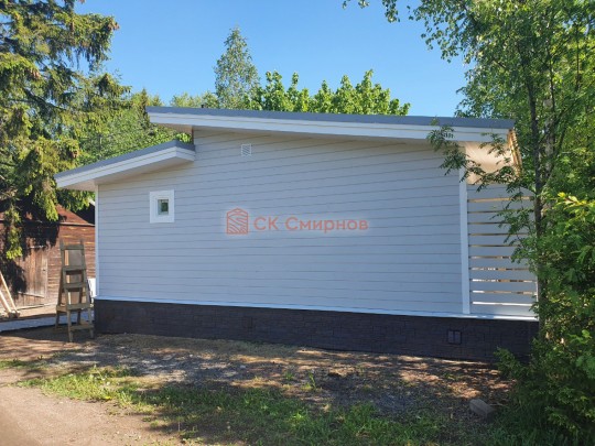 В июне 2020 мы строили красивую современную каркасную баню под ключ для смелых, готовых к нестандартным решениям клиентов. Был выбран одноэтажный проект бани с панорамными окнами, стеклянной дверью-стеклопакетом и дизайном в стиле Хай-Тек.