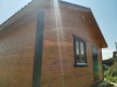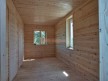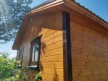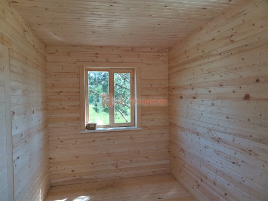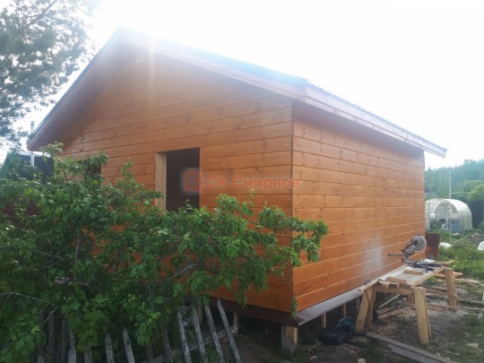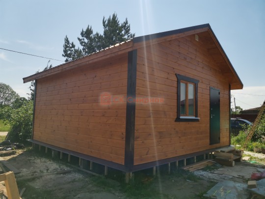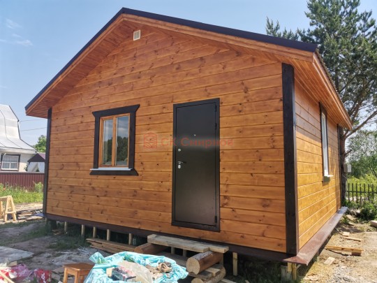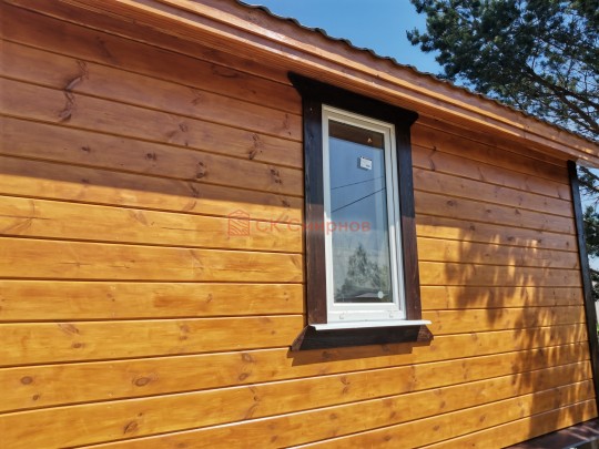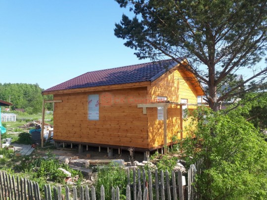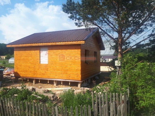 Это одноэтажная дача 6 на 6 с нежилым чердаком (лестницы нет). Пространство внутри разделено на 3 помещения. В основе лежит брусовой каркас, который снаружи обшит имитацией бруса 20х190, а изнутри сортовой вагонкой. Двускатная крыша покрыта хорошей металлочерепицей GrandLine с полимерным напылением. Изначально ставили деревянные стеклопакеты, но в ходе строительства клиент поменял решение и привёз свои пластиковые окна. Входная дверь Аргус 9.